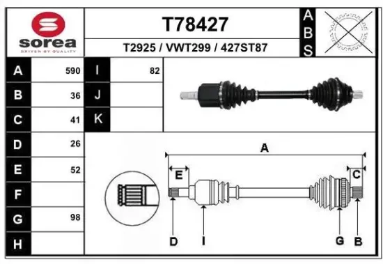Das Produkt Antriebswelle des Herstellers EAI hat einen Durchmesser2 von 82 mm. Der Durchmesser1 beträgt 98 mm, die Außenverzahnung differenzialseitig beträgt 26 und die Außenverzahnung radseitig beträgt 36. Antriebswelle hat eine Länge von 590 mm und passt beispielsweise zu Fahrzeugen von SKODA und VW.