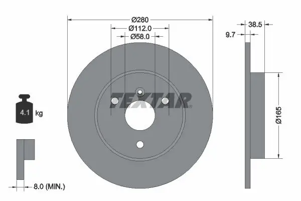 Das Produkt Bremsscheibe des Herstellers TEXTAR hat ein Gewicht von 4,1 kg. Die ergänzenden Artikelinformationen lauten ohne Radnabe ohne Radlager ohne Radbefestigungsbolzen, die Bremsscheibenart ist voll und der Lochkreis ist 112 mm. Der Innendurchmesser beträgt 153 mm und der Außendruchmesser beträgt 280 mm. Bremsscheibe hat eine Höhe von 38,5 mm und passt beispielsweise zu Fahrzeugen von SMART.