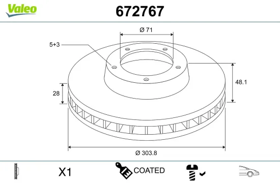 Das Produkt Bremsscheibe des Herstellers VALEO hat die Bremsscheibenart belüftet. Das Gewicht beträgt 9,25 kg, die Lochzahl der Felge beträgt 5 -loch und der Artikel besitzt das Prüfzeichen ECE-R90. Der Außendruchmesser beträgt 304 mm, die Höhe lautet 48,1 mm und die ergänzenden Artikelinformationen lauten ohne integriertes Radlager. Bremsscheibe hat die Anzahl an Befestigungsbohrungen 3 und passt beispielsweise zu Fahrzeugen von PEUGEOT, TOYOTA, CITROËN und OPEL.