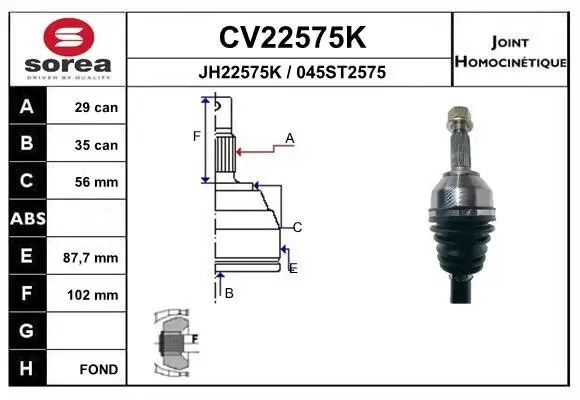 Das Produkt Gelenksatz, Antriebswelle des Herstellers EAI hat eine Außenverzahnung radseitig von 29. Der Außendruchmesser beträgt 88 mm. Es kann beispielsweise an Fahrzeugen des Herstellers RENAULT und NISSAN verwendet werden.